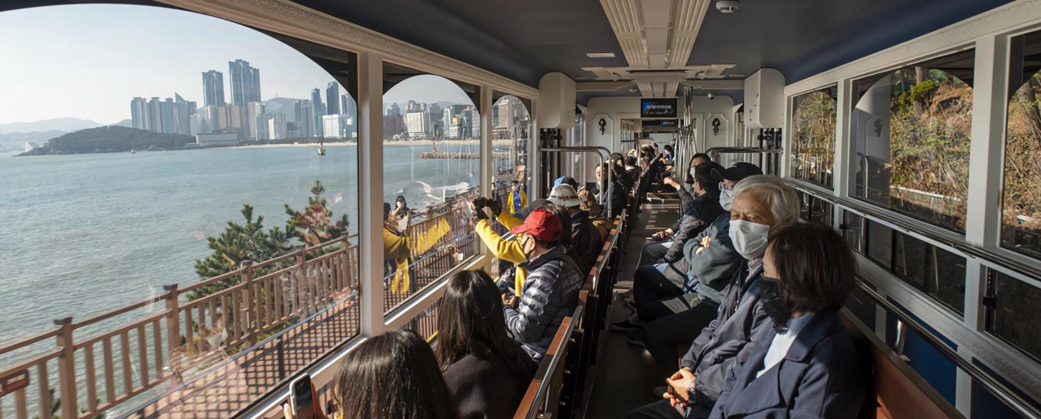 釜山的最新景點、最熱門打卡及拍照的地點!海濱列車全是面海的坐位,所以不管坐哪裡其實沒有太大差別啦!有二長排坐位可隨意找喜歡的位子坐下,隨著列車緩慢前行,眺望一望無際的海景,可說是相當療癒,也是國外旅客爭相前往的景點。