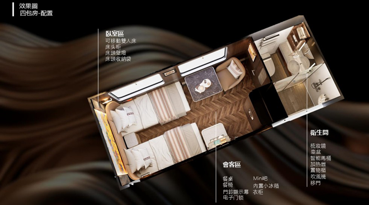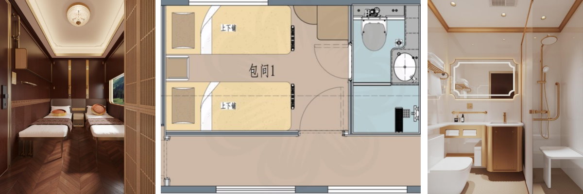所有包廂均配備休閒桌椅、獨立衛浴,乾濕分離,車廂內的熱水是24小時源源不絕供應,讓乘客可以隨時享受舒適的淋浴時光。每個包廂同時還增設風量調節開關,床頭處備有用於電腦、手機充電及帶USB介面的5芯插座。搭配全新打造的餐廳車、廚房車、娛樂車,更好服務於產品品牌。