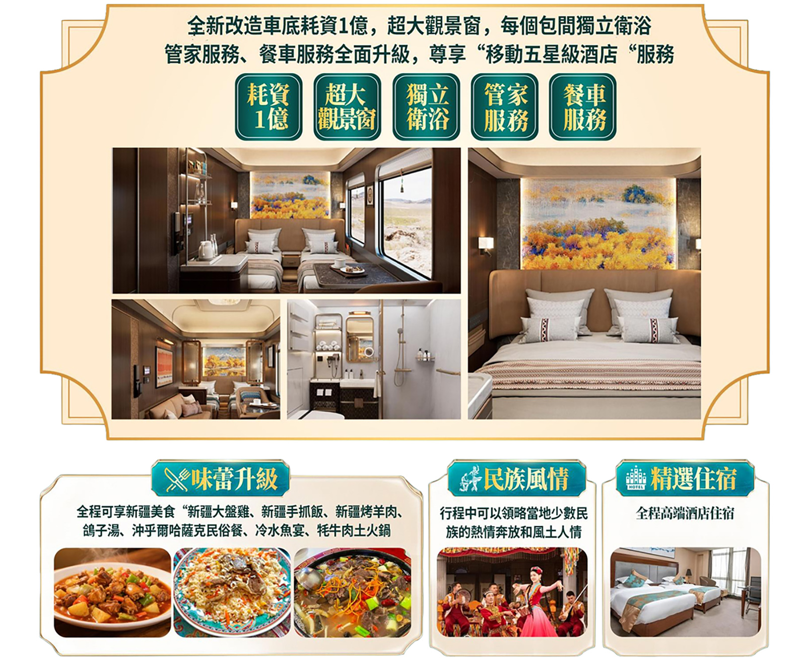全新改造車底耗資1億,超大觀景窗,每個包間獨立衛浴;管家服務、餐車服務全面升級,尊享 “移動五星級酒店“服務。