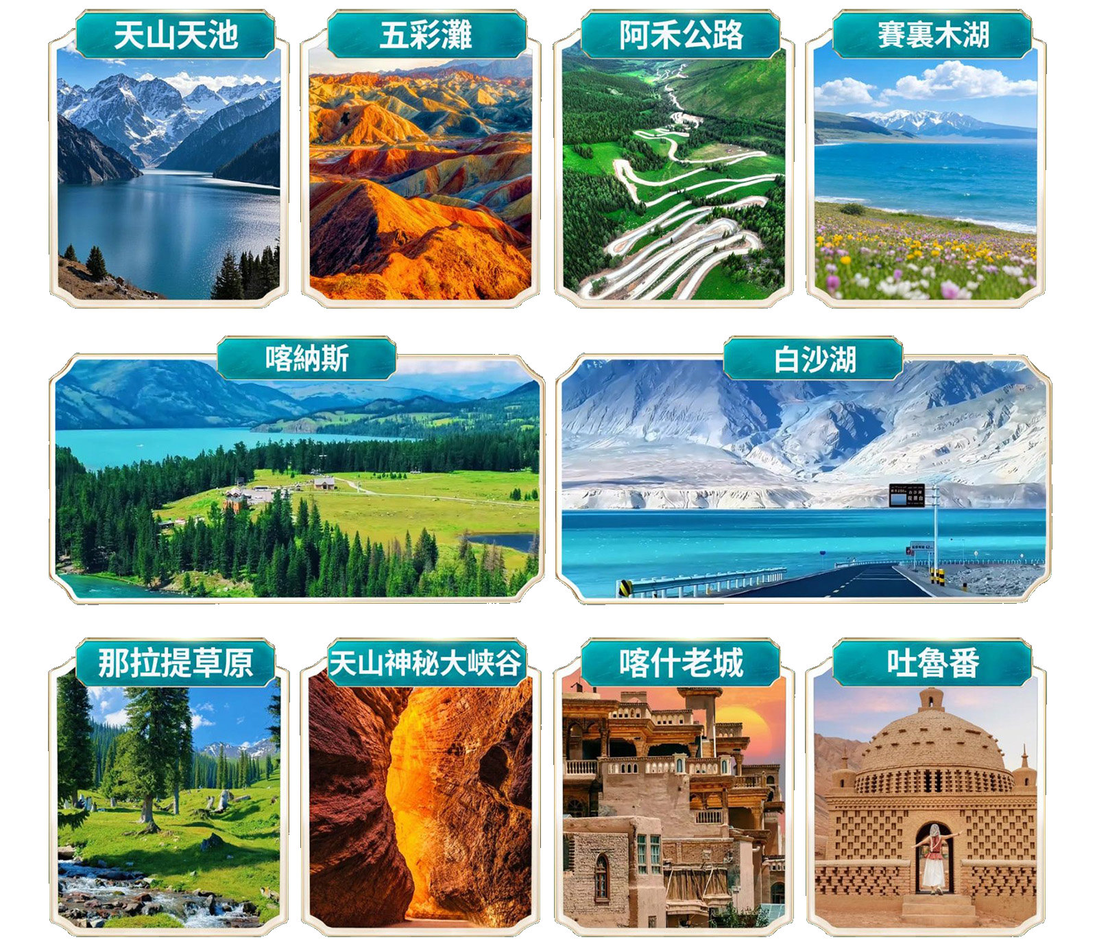 烏魯木齊-可哥托海-阿勒泰-阿禾公路-禾木-喀納斯-五彩灘-賽裡木湖-那拉提草原-克孜爾千佛洞-熱斯坦老街-天山神秘大峽谷-卡拉庫裡湖-白沙湖-喀什老城-艾提尕爾清真寺-坎兒井