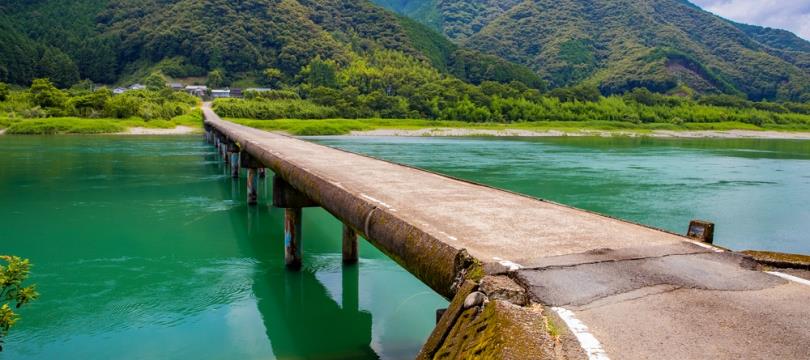 沉下橋是四萬十川最著名景觀。其設計的由來,是為了因應川水暴漲時不被沖毀。這類橋樑沒有護欄,當水位上升時,橋面會順勢「沉下」水中,讓水流平穩通過。這種與大自然共存的設計,充分展現了當地居民的智慧。
