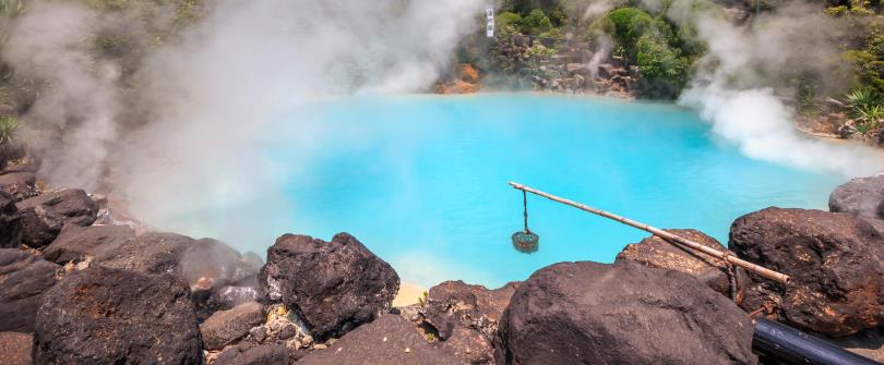 海地獄因含有硫酸鐵,呈現夢幻般的鈷藍色,彷彿大海,故得其名。其泉水高達98度,濃濃的白色蒸氣裊裊上升,營造出神秘氛圍。園區內還可品嚐溫泉蒸煮的蛋和布丁,並享受免費足湯。