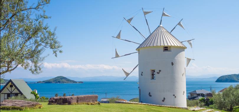 小豆島是日本第一個成功栽培橄欖的地方,製作至今已有百年歷史,由於橄欖油原產於地中海,因此園區將每一處打造成宛如置身地中海般,這座白色希臘風車是為了紀念與希臘小島結為姊妹島而建,讓人真的有不在日本的錯覺。