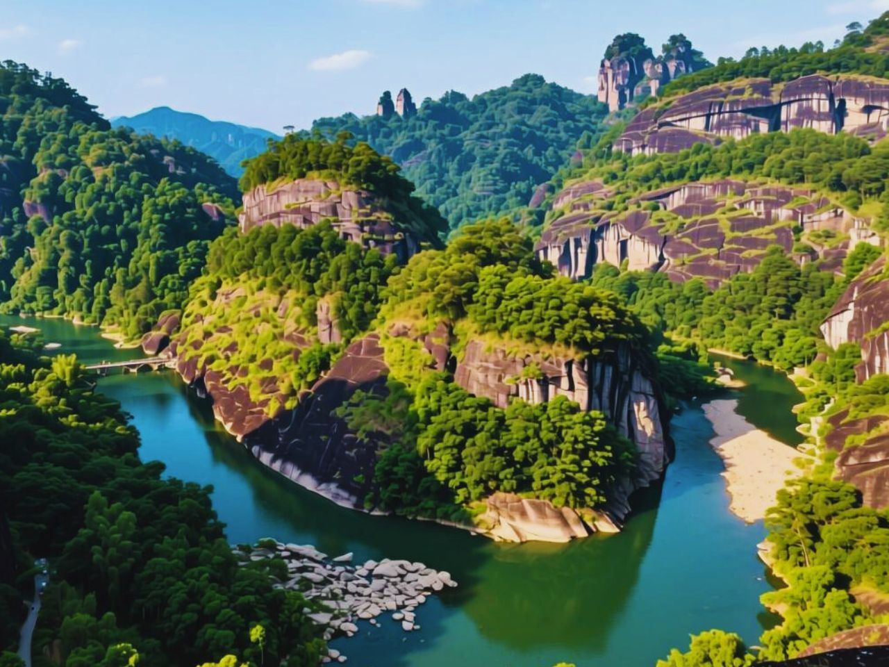 人在畫中遊的奇幻體驗【九曲溪竹筏漂流】這條溪流發源於武夷山深處,全長約九公里,蜿蜒曲折地穿過層層山峰,被譽為「一溪貫群山」。遊客將乘坐以毛竹綁製的傳統竹筏,由兩位船工撐篙掌舵,順著溪流悠悠而下。竹筏滑過碧綠的水面,溪水清澈見底,魚群悠游其間。兩岸奇峰對峙,形狀各異的丹霞山石在陽光照射下色彩變幻,時而赤紅、時而赭黃,彷彿一幅天然山水畫。船夫會以當地方言,講述這些山峰的名字與傳說——「大王峰」雄偉如君王之姿,「玉女峰」秀麗婉約,傳說是大王的心上人;「仙掌峰」似掌朝天,「三仰峰」又如三尊佛像安坐雲間。每轉一個彎,景色皆不同,水流緩急交錯,讓人不禁讚嘆大自然的巧奪天工。途中還能見到刻於山壁上的古代題字,如「第一山水」、「天遊勝地」等,皆出自歷代文人雅士之手。