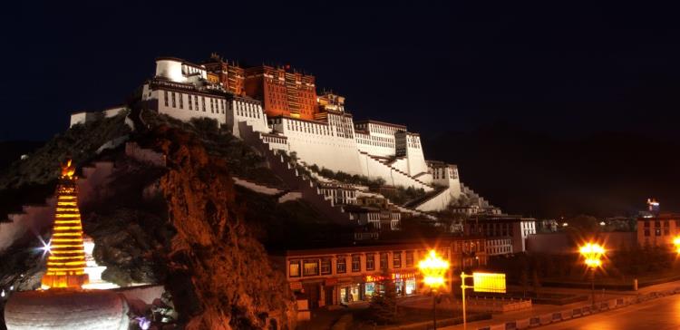 夜晚的布達拉宮神秘迷人,美麗莊嚴,和諧的燈光透露出布達拉宮的聖潔,高大中蘊含的祥和寧靜。廣場上如流的遊人在用心探究著自己的好奇。巨大燈柱悠然點亮,配上景觀燈白熾光的投射,布達拉宮通體泛出誘人的光亮。